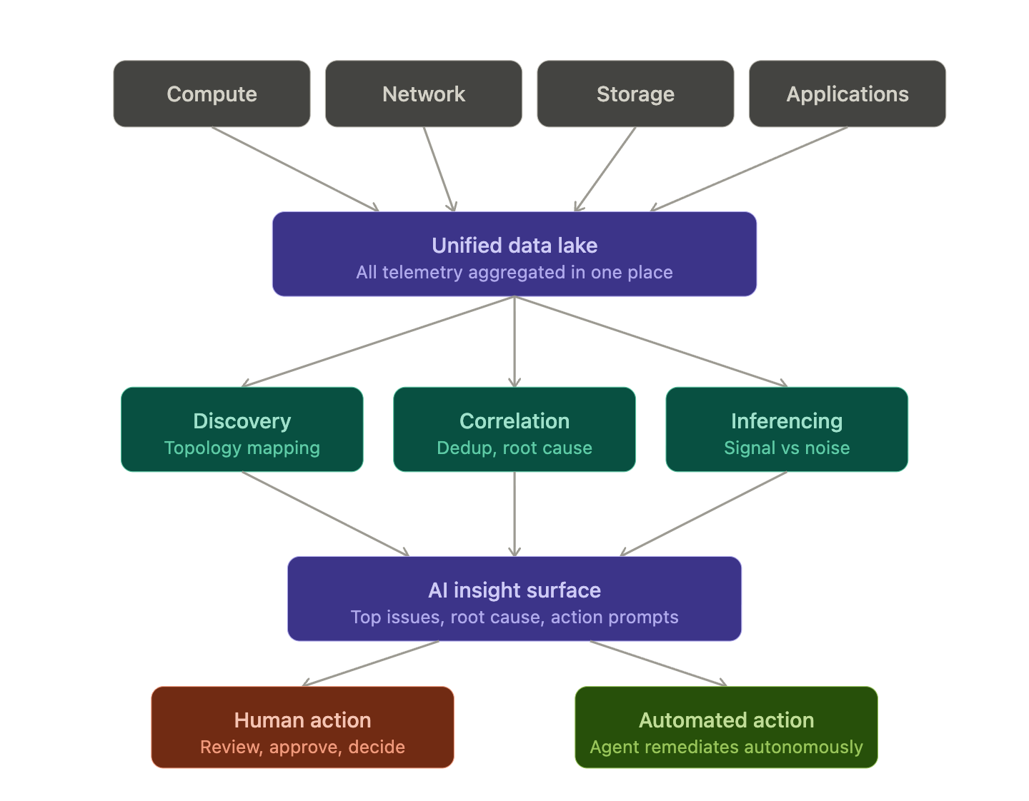 Raw telemetry from across a hybrid IT estate flows into a unified data lake, where AI reasons over it to surface only what matters — routing each insight to either a human engineer or an autonomous remediation agent.