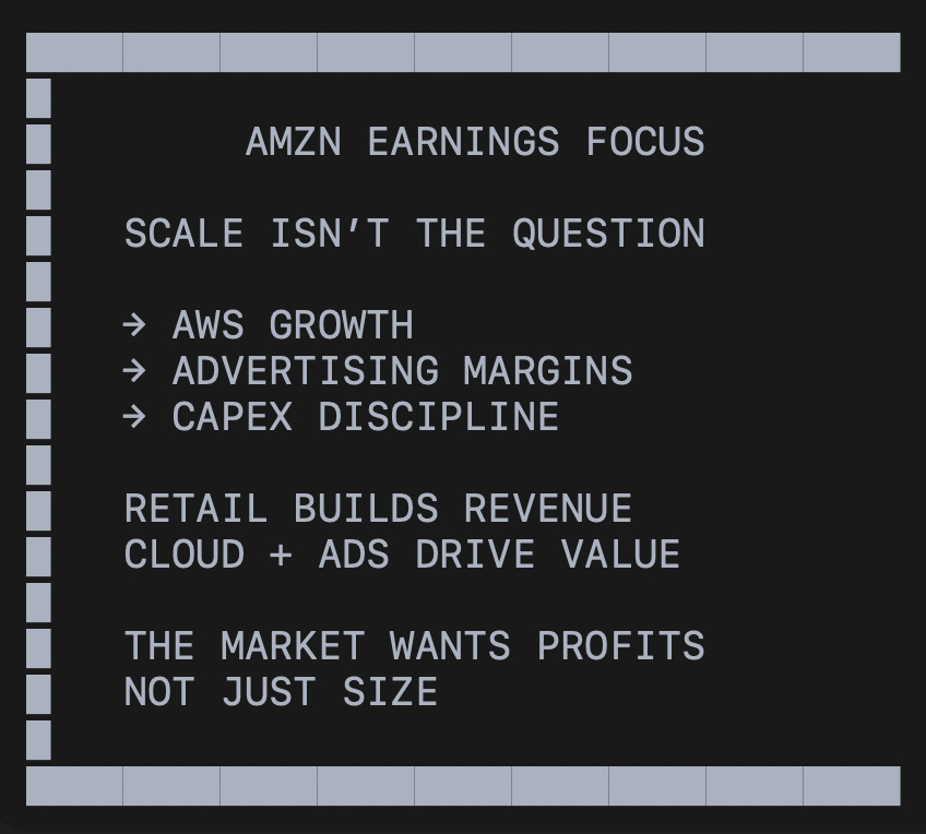 In short, Amazon doesn’t need to prove demand exists—it needs to prove that high-margin growth can persist. Earnings will be judged less on beats or misses and more on AWS momentum, advertising strength, and confidence in margin expansion.