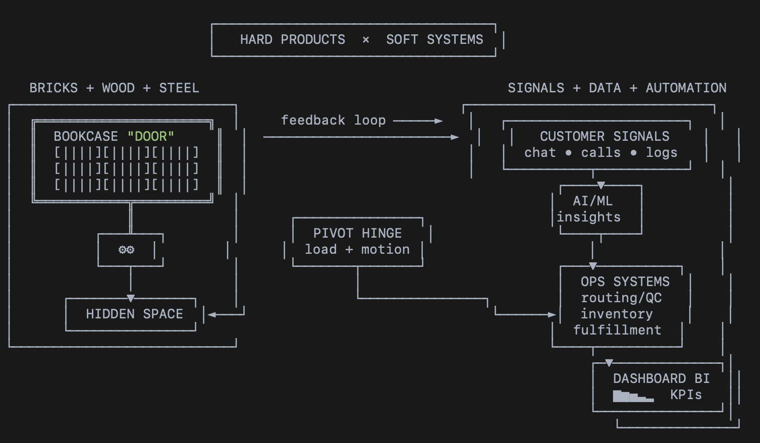The business was built by identifying an unmet niche rather than optimizing within an existing category. The product focused on hidden, load-bearing doors integrated into cabinetry and walls, requiring custom hardware design, patentable hinge systems, and standardized manufacturing constraints to enable scale. Early go-to-market relied entirely on direct-to-consumer e-commerce, pre-selling high-ticket physical products with minimal brand trust, no showrooms, and limited prior validation. Growth was driven by rapid iteration from live customer feedback, vertical integration of manufacturing, and a shift from selling components (hardware) to complete systems (finished doors), increasing both margins and defensibility.