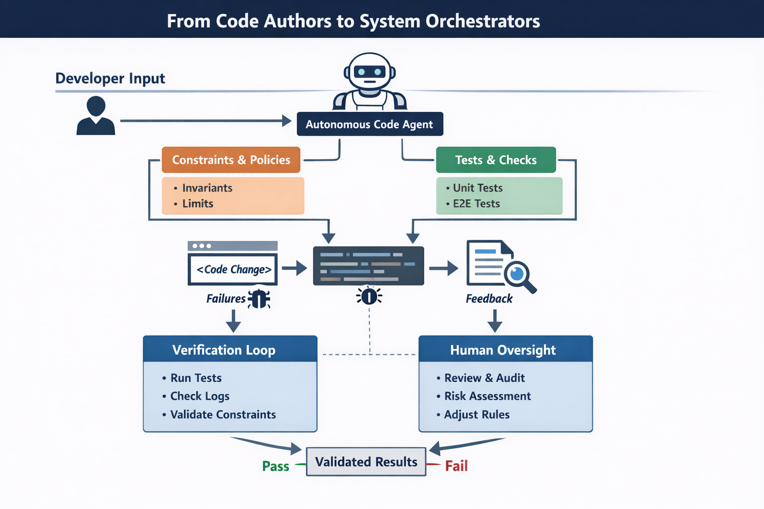 Software development is undergoing a structural shift. The change is not that code is being generated instead of written—that transition already happened. The deeper change is that software systems are increasingly built, modified, and maintained by autonomous agents operating inside constraints defined by humans. Developers are moving from being primary code authors to becoming system designers, auditors, and orchestrators.