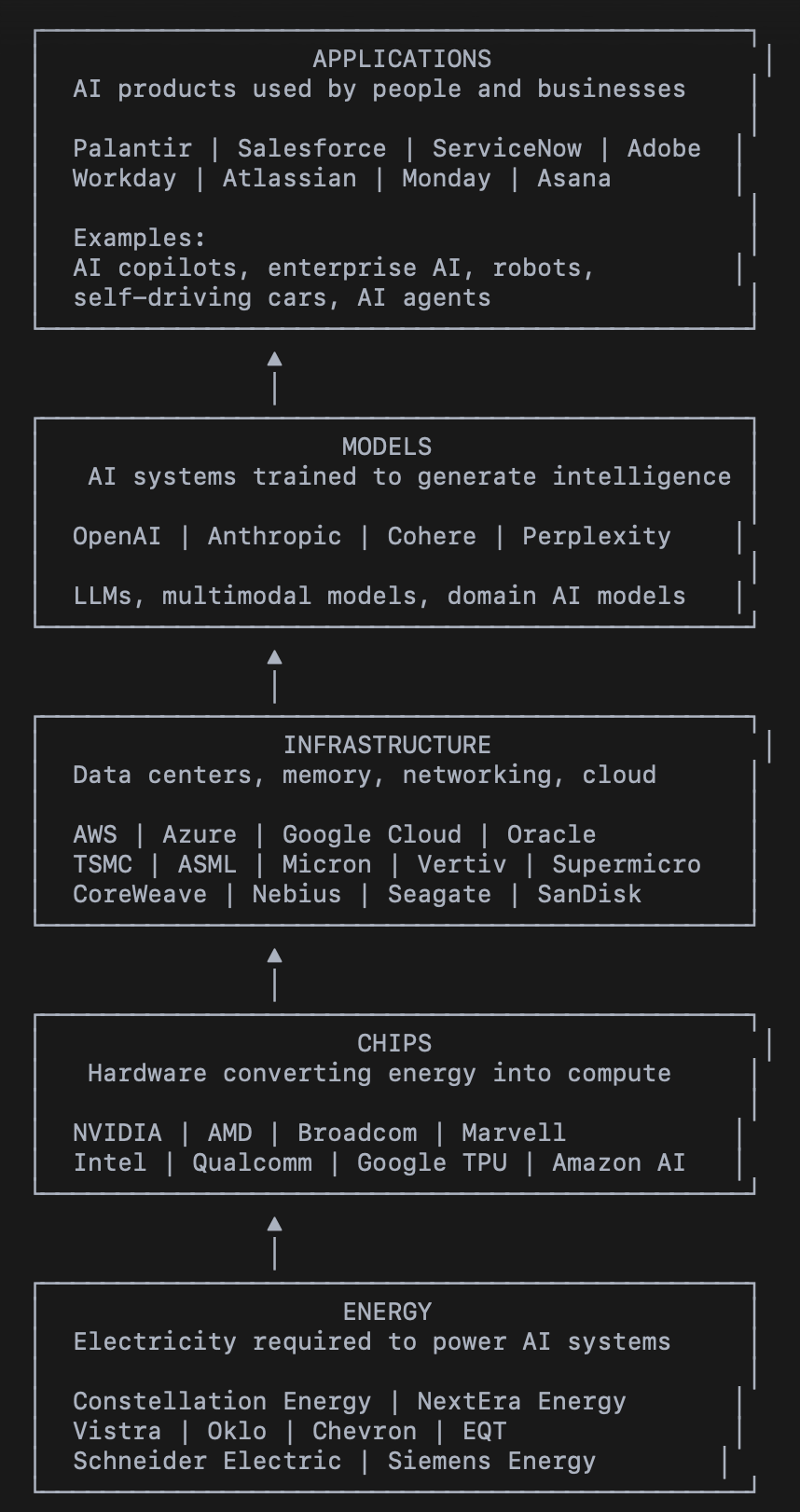 Together, these five layers form the complete AI economy, spanning energy, semiconductors, cloud infrastructure, machine learning research, and enterprise software.