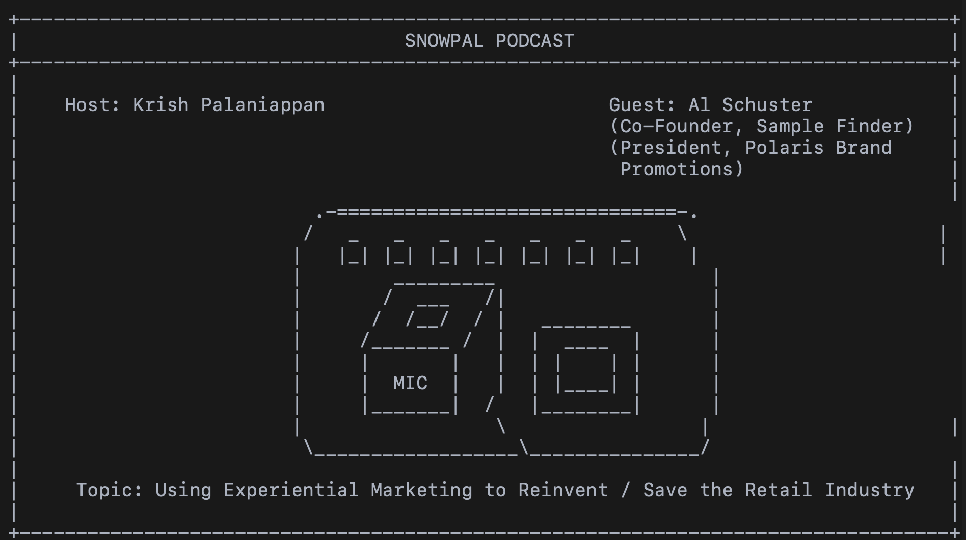 In a recent episode of the Snowpal Podcast, Krish sat down with Al Schuster, Co-Founder of Sample Finder and President of Polaris Brand Promotions, to discuss a timely and pressing topic: using experiential marketing to save the retail industry . Krish, a product leader and technology entrepreneur, guided the conversation through retail disruption, digital transformation, and the future of in-store engagement. Al brought firsthand industry insight from nearly a decade of building experiential brand activations across brick-and-mortar environments. Together, they explored how technology and human-centered experiences can coexist to reshape the future of retail.