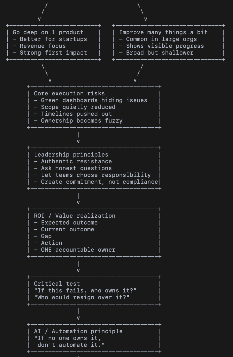 A striking theme in Sridhar’s perspective is that transformations rarely fail because of strategy alone. In many cases, the plan itself is reasonable. The real breakdown happens in execution, ownership, and leadership. Accountability becomes diffused. Risks get buried in dashboards, committees, and status updates. What looks green on paper may still be red underneath. Teams may quietly reduce scope, shift timelines, or make tradeoffs that make reports look better without actually solving the core problem.