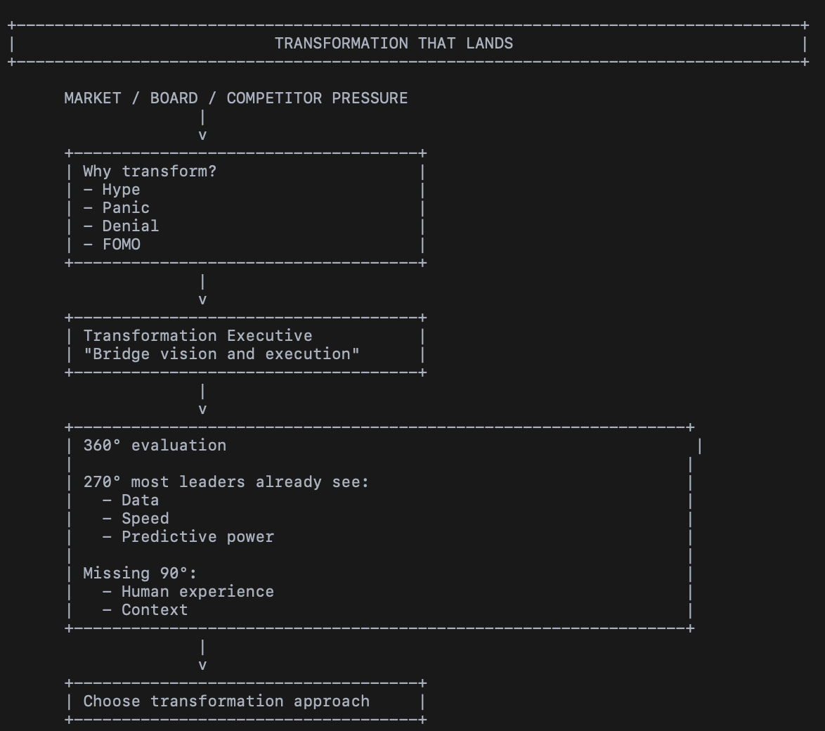 Transformation leadership turns vision into lasting change by aligning strategy, customer needs, execution, accountability, and human judgment for measurable results.