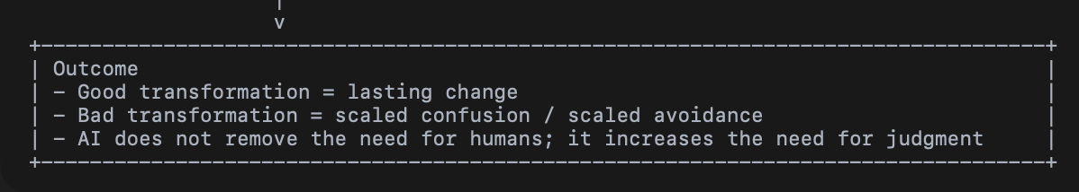 This is the heart of the “humans at scale” idea. AI does not create leadership gaps; it exposes them. If ownership is weak, automation scales avoidance rather than efficiency. If no one is willing to stand behind a process when it fails, automating that process only makes the failure larger and faster. That is why transformation in the AI era must strengthen human accountability, not weaken it.
