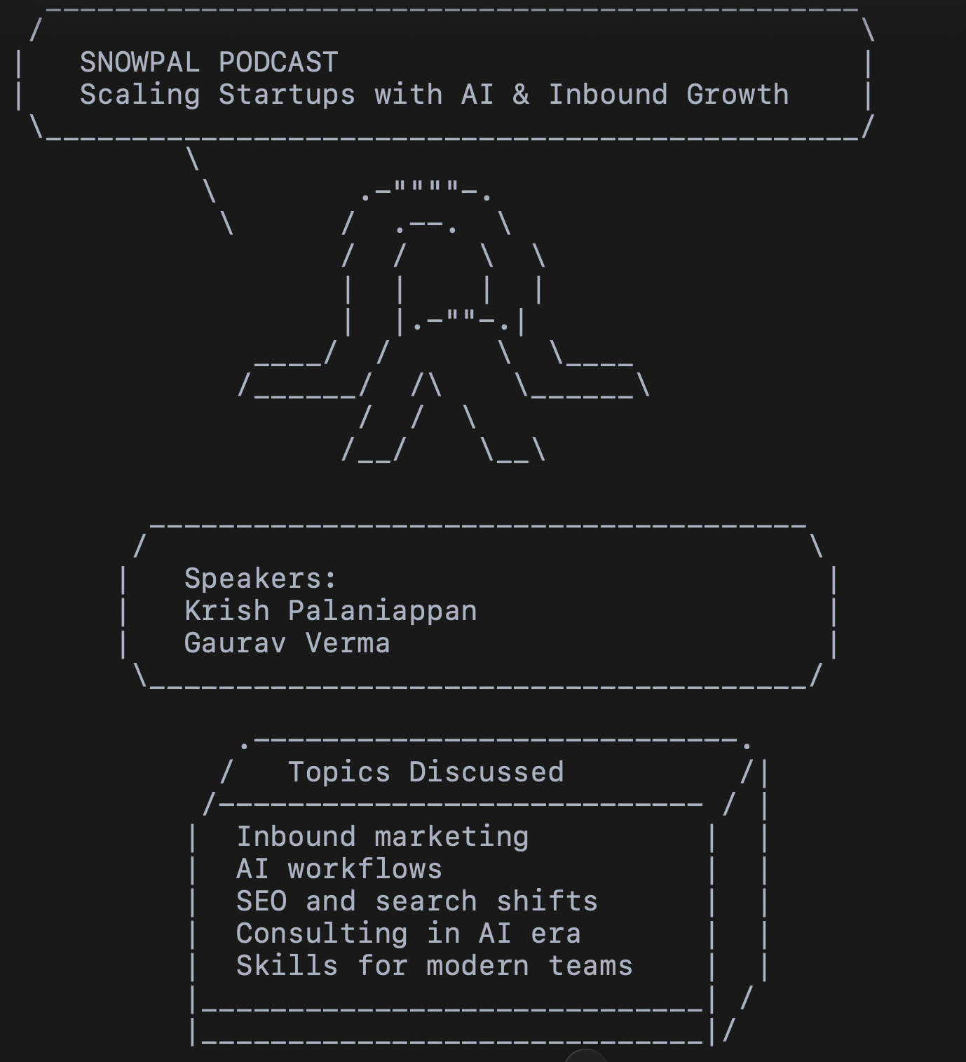 In this episode of the Snowpal Podcast, Krish hosts Gaurav Verma, Chief Marketing Officer at Kanerika, for a conversation about scaling early-stage technology companies. Their discussion explores how startups can build effective inbound marketing engines with limited budgets, leverage AI to streamline marketing workflows, and distribute content across modern platforms. They also examine the shift from traditional SEO to broader search strategies, the evolving future of consulting in the AI era, and the skills professionals need to succeed in a rapidly changing technology landscape.