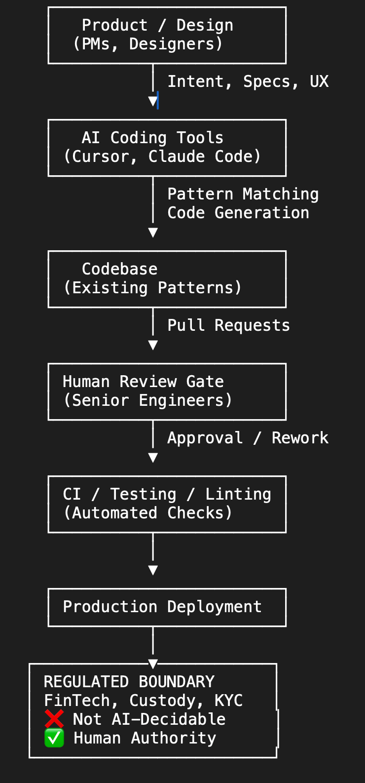 AI accelerates implementation—not responsibility. Serious products still require domain expertise, legal oversight, and institutional trust.